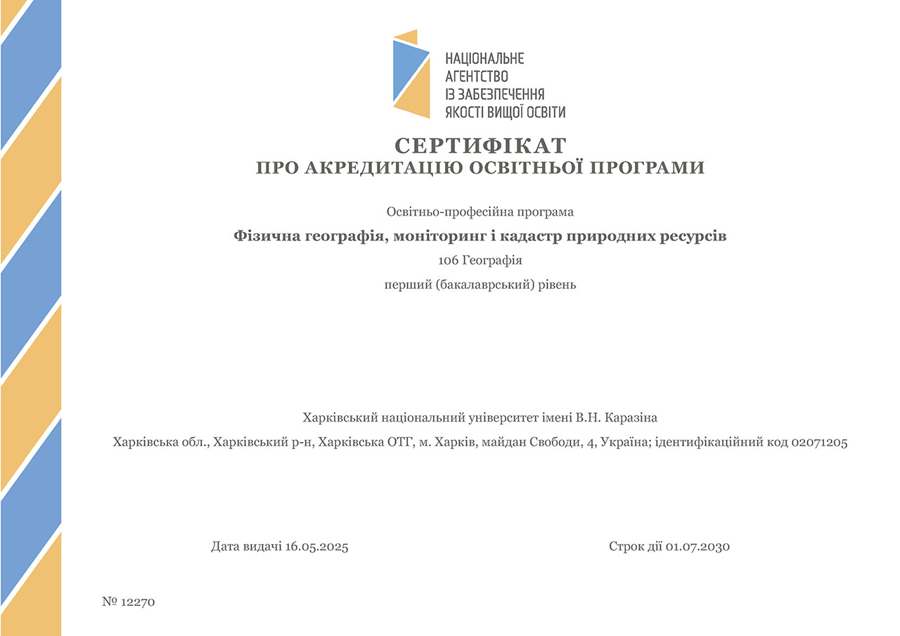 26-28 лютого 2025 року відбулася дистанційна акредитація експертами освітніх програм кафедри фізичної географії та картографії першого (бакалаврського) рівня «Фізична географія, моніторинг і кадастр природних ресурсів» і «Картографія, геоінформатика і кадастр». На основі підготовленого експертами звіту Національне агенство із забезпечення якості вищої освіти прийняло рішення про акредитацію освітніх програм, яка діятиме до 01.07.2030 року.