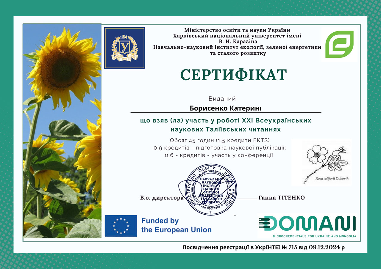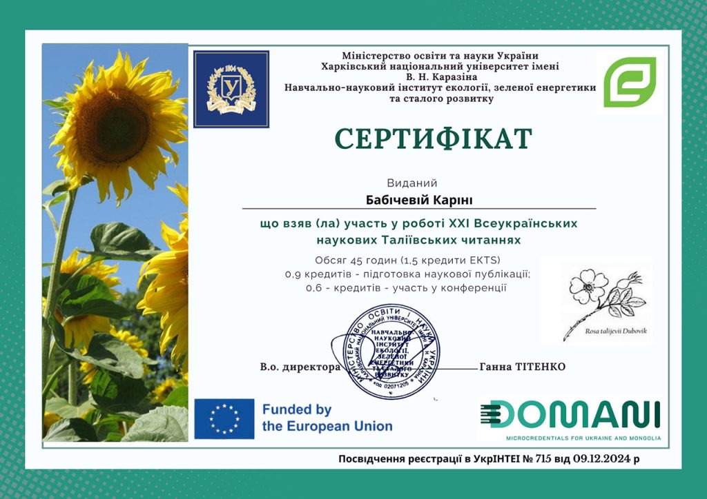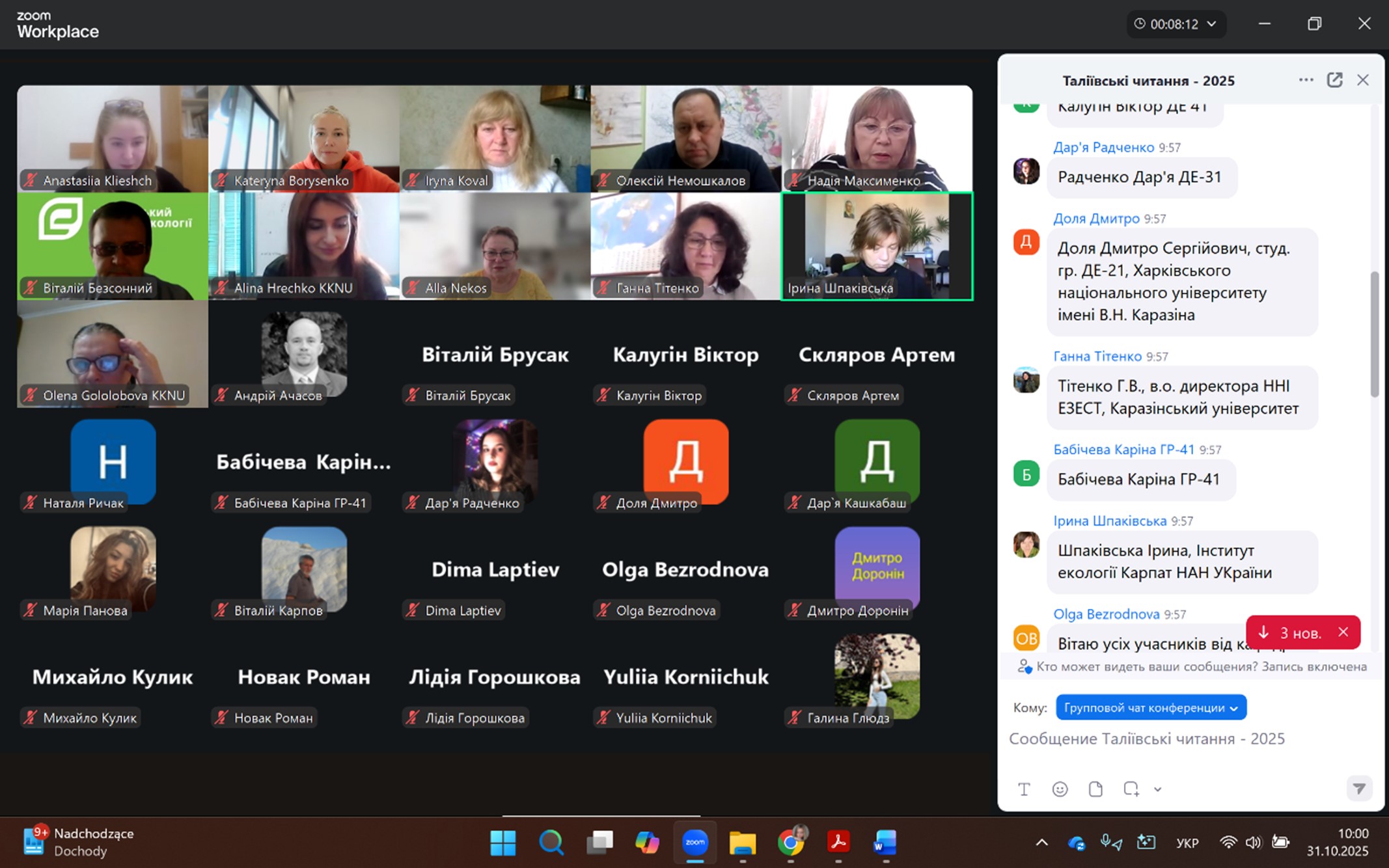 31 жовтня 2025 року в Каразінському навчально-науковому інституті екології, зеленої енергетики і сталого розвитку традиційно відбулися ХХІ Всеукраїнські наукові Таліївські читання, що пройшли за підтримки проєкту Erasmus+ DOMANI. Цьогоріч конференція зібрала 77 тез доповідей від представників закладів вищої освіти, наукових установ, природоохоронних організацій та фахових коледжів з різних регіонів України.